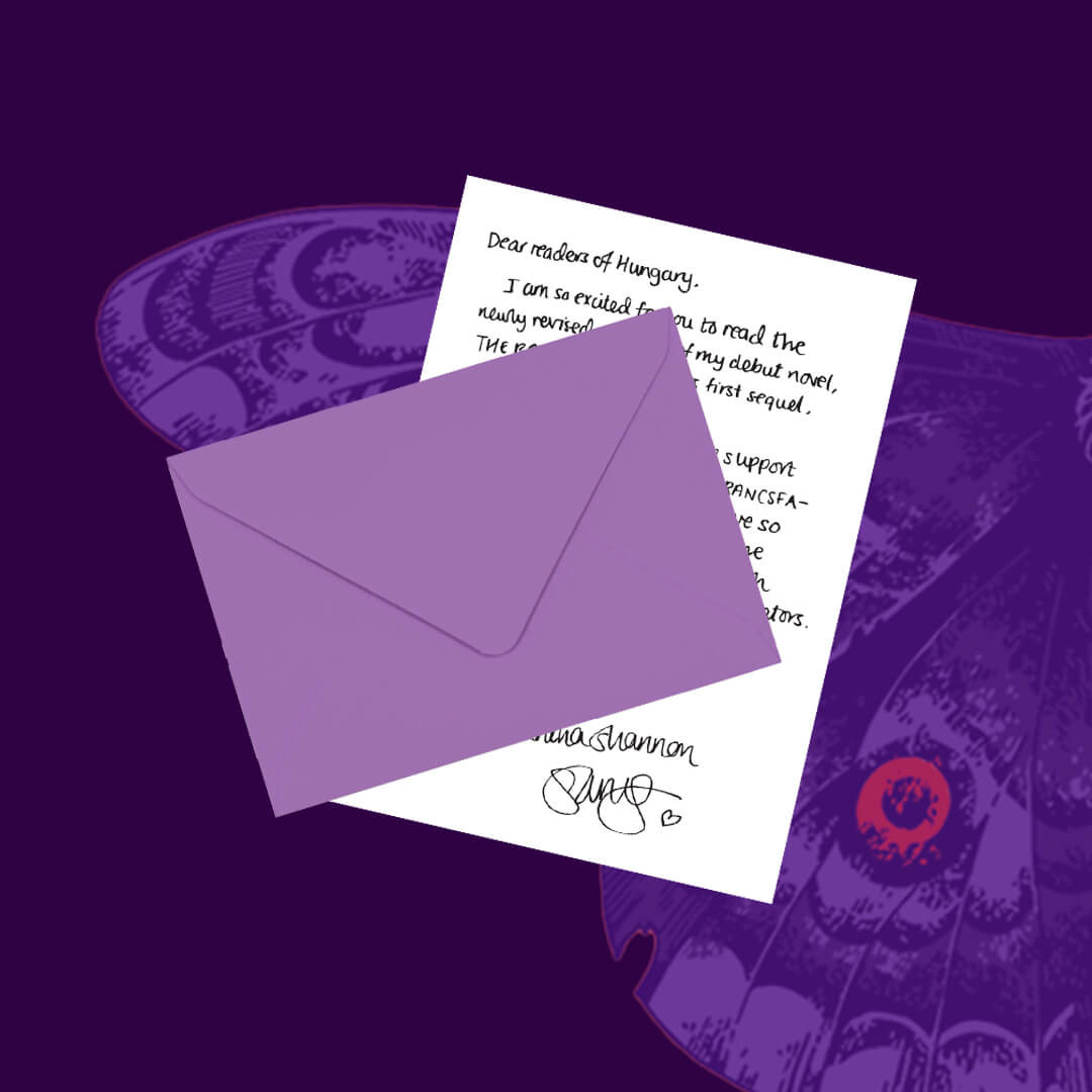 Samantha Shannon kézzel írt, kizárólag a magyar olvasókhoz szóló üzenetét és a szerző aláírását egy csodaszép lila borítékban kapod kézhez.