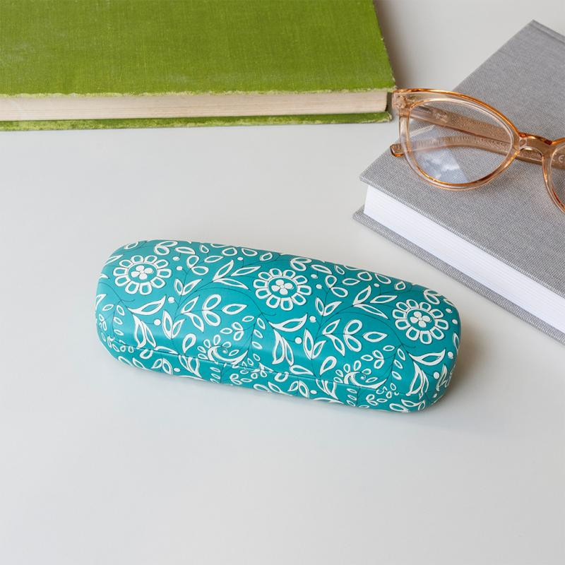Elegáns és visszafogott mintával kemény szemüvegtok kék színben.